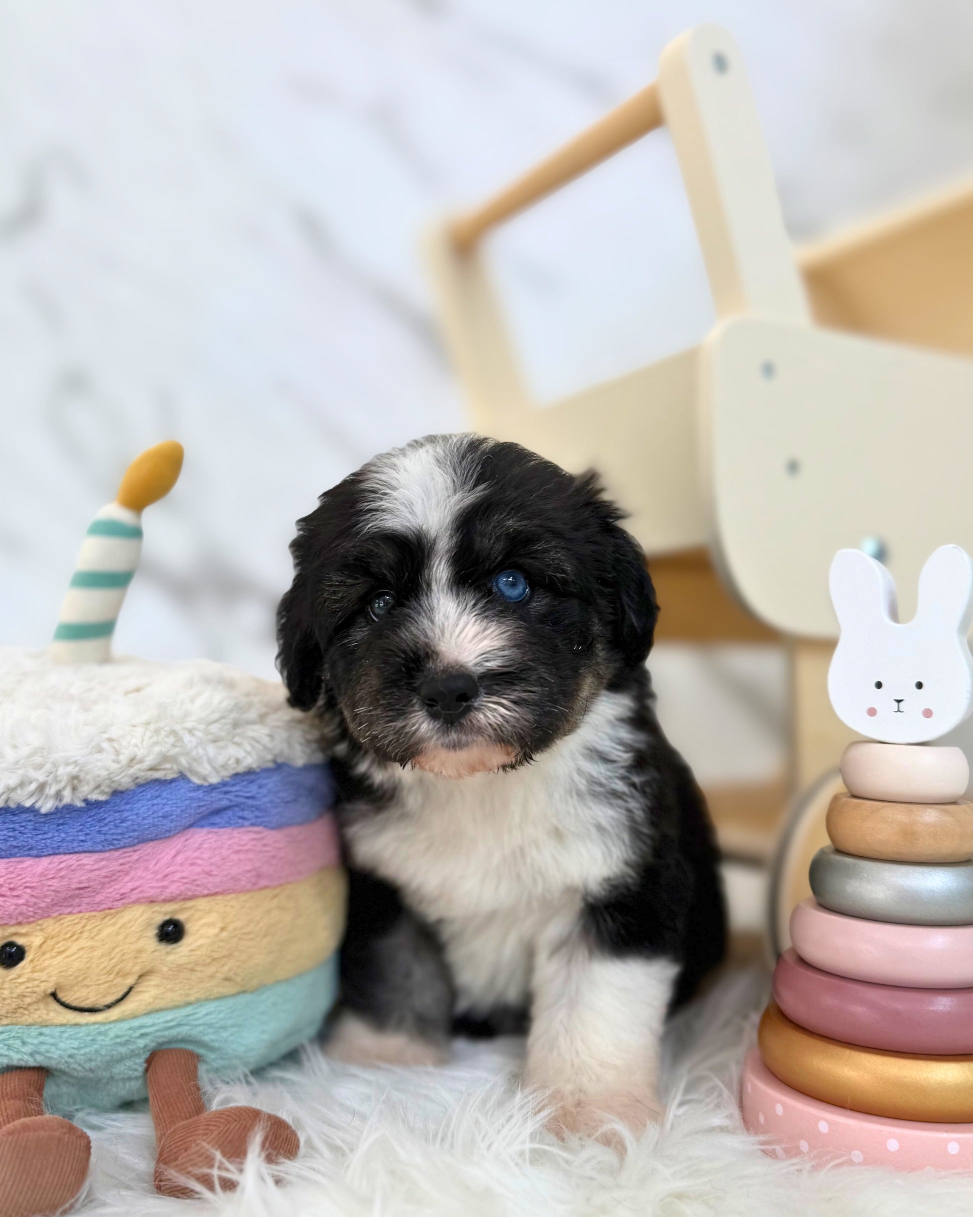 Stormi is a Husky x Miniature Poodle — Stormi is a beautiful black-and-white Husky Doodle girl with one stunning blue eye. She has a chonky, fluffy body structure, a super sweet temperament, and a playful, goofy personality that melts hearts instantly.